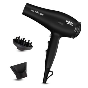 Ikonic Ultralight Professional Hair Dryer 2000 Watts with Nozzle, Diffuser, Hot and Cold Air Feauture, 2 Speed 3 Heat Settings with Cool Shot, Hanging Loop, for both Men and Women, Suitable for all Hair Types, 1 yr Warranty Black is available on Amazon.