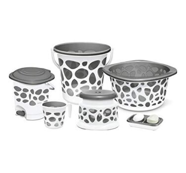 Milton Duplex Spa 6 PCS Bathroom Set, Sturdy and Durable, Bucket 18L, Deep Tub 20L, Dustbin, Stool, Soap Holder and Mug 1L, Lightweight and Rigid, Plastic Bathware Combo, Easy to Clean Grey is available on Amazon.