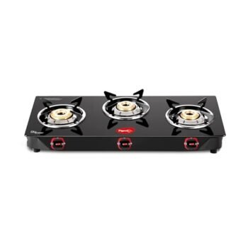 Pigeon by Stovekraft Aster 3 Burner Gas Stove with High Powered Brass Burner Gas Cooktop, Cooktop with Glass Top and Powder Coated Body, Black, Manual Ignition, Standard (14267) is available on Amazon.