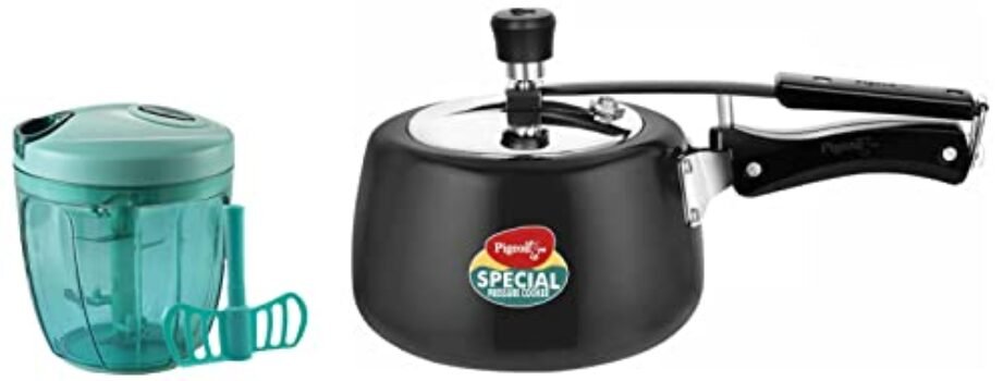 Pigeon by Stovekraft Hard Anodised Aluminium Inner Lid Cooker – 3 Litre with Induction Base (Contura), medium & Handy Chopper with 5 Stainless Steel Blades and 1 Plastic Whisker (XL, Green) is available on Amazon.